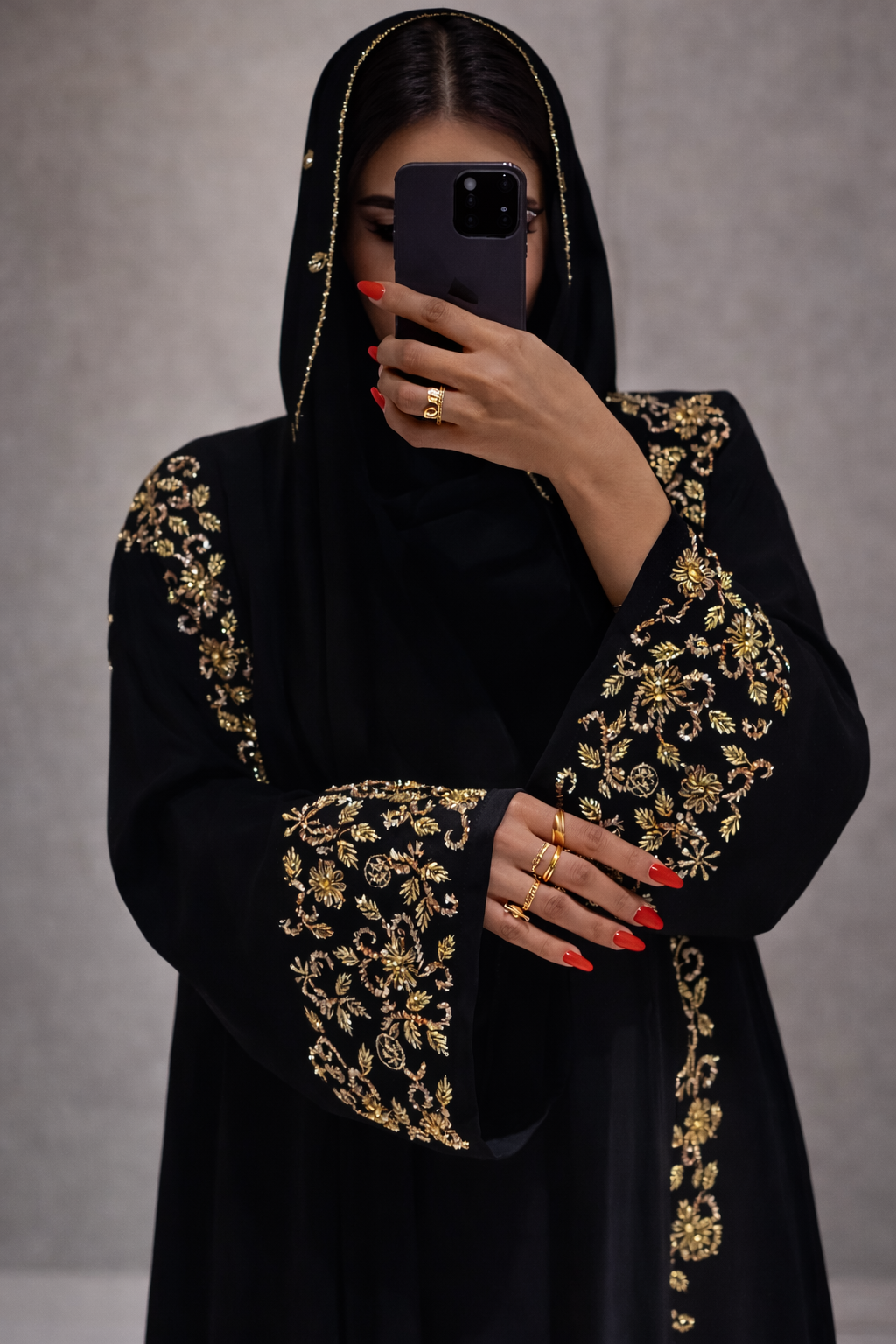 This luxurious black abaya is exquisitely adorned with rich hand-embroidered floral motifs extending from the shoulders down to the sleeves. The intricate design is crafted using fine golden thread work, enhanced with delicate bead and sequin accents that add a soft, elegant shimmer. The dense embroidery placement creates a statement look while maintaining refined balance and grace. Made from premium-quality, smooth and flowy fabric, this abaya drapes beautifully, offering both comfort and sophistication. Perfect for formal occasions, festive celebrations, and elegant evening wear, this piece embodies timeless luxury and artisanal craftsmanship.