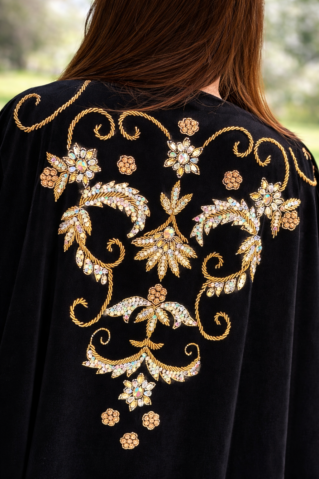 This stunning black abaya features breathtaking hand-crafted embroidery on the back, designed with ornate floral and scroll motifs in a rich symmetrical pattern. The intricate artwork is embellished with fine golden thread work, shimmering crystals, beads, and sequin accents, creating a luxurious and radiant finish. The detailed craftsmanship adds depth, texture, and a regal charm, making the back design a true statement piece. Crafted from premium-quality, smooth and flowy fabric, this abaya drapes beautifully while offering exceptional comfort. Perfect for weddings, grand occasions, and formal evening wear, this piece reflects timeless elegance and couture-level artistry.