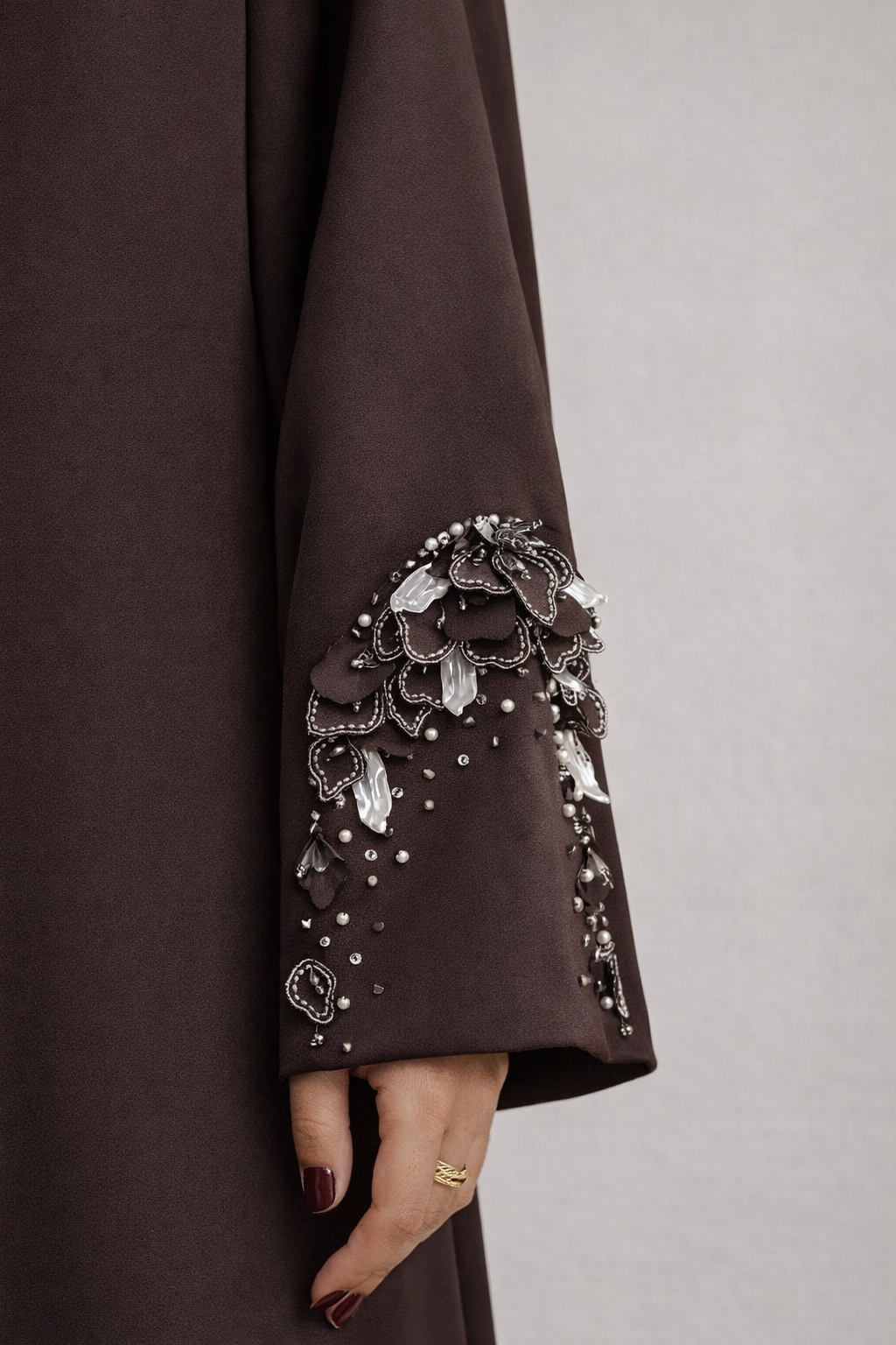 This elegant abaya is beautifully accented with intricate hand-crafted floral embroidery on the sleeve. The design features layered floral motifs highlighted with fine metallic thread work, delicate bead detailing, and subtle crystal accents that add a refined shimmer. The structured placement of the embellishment creates a balanced and sophisticated look while maintaining a clean, modern silhouette. Crafted from premium-quality, smooth and flowy fabric, this abaya offers effortless draping and exceptional comfort. Ideal for formal occasions, evening wear, and understated festive looks, this piece reflects timeless elegance with contemporary craftsmanship.