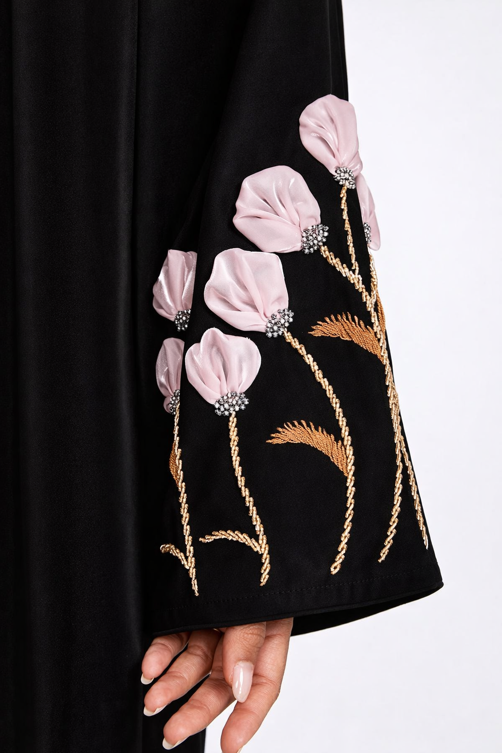 This elegant black abaya is beautifully adorned with delicate hand-crafted floral appliqué along the sleeve hem. The design features soft pastel fabric petals shaped into graceful blooms, complemented by fine bead accents and detailed golden thread embroidery forming slender stems and leaves. The three-dimensional floral detailing adds depth and feminine charm, while the refined embroidery enhances the overall elegance of the piece. Crafted from premium-quality, smooth and flowy fabric, this abaya drapes effortlessly and offers exceptional comfort. Perfect for festive occasions, formal gatherings, and elegant evening wear, this design reflects a harmonious blend of modern artistry and timeless craftsmanship.