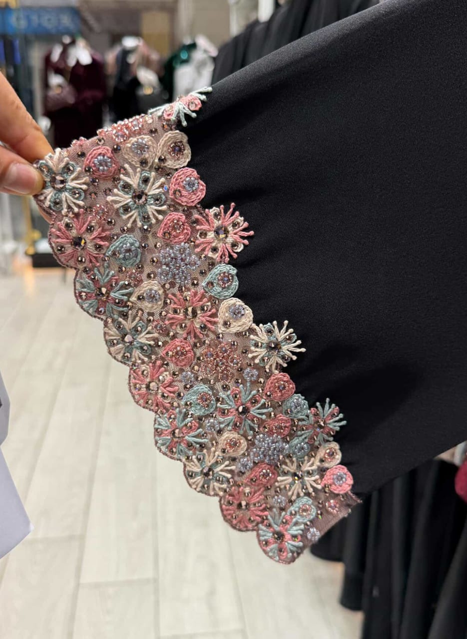 This graceful black abaya features exquisite hand-embroidered sleeve detailing, adorned with intricate floral motifs. The embellishment is enriched with fine beadwork, sequins, and delicate thread embroidery in soft pastel shades, creating a luxurious and elegant contrast against the black fabric. Crafted from premium, soft-flowing material, this abaya offers a refined silhouette with exceptional comfort, making it ideal for special occasions and elegant evening wear.