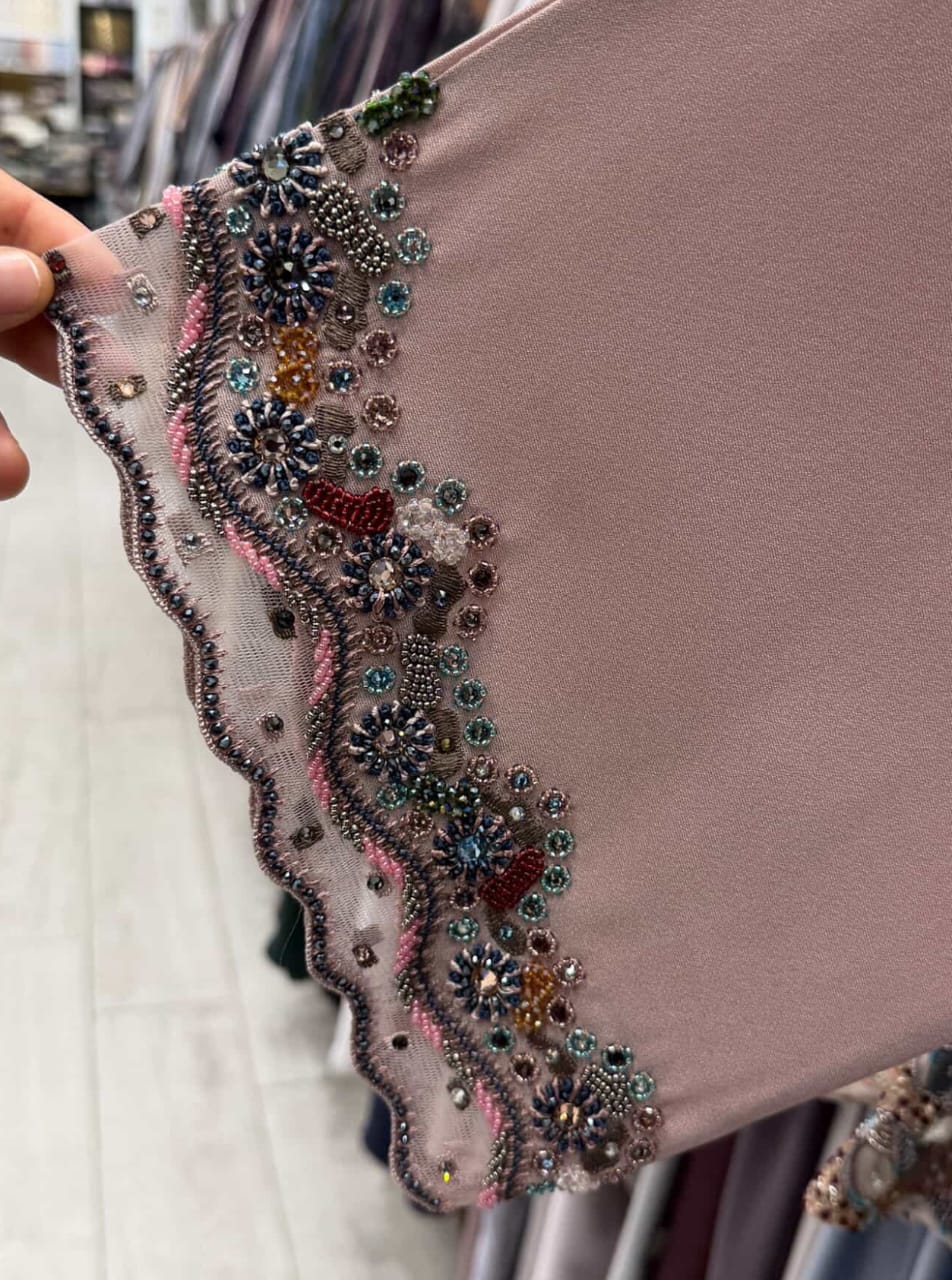 This elegant abaya features beautifully handcrafted sleeve embellishment highlighted with intricate floral motifs and delicate geometric patterns. The scalloped net sleeve edge is richly adorned with fine beadwork, shimmering crystals, sequins, and detailed thread embroidery in soft pastel tones, creating a refined and graceful look. The combination of textured embellishments and subtle shine adds depth and luxury without overpowering the design. Crafted from premium-quality, smooth and flowy fabric, this abaya drapes effortlessly, offering both comfort and sophistication. Ideal for festive occasions, formal gatherings, and elegant evening wear, this piece reflects timeless artistry and refined craftsmanship.