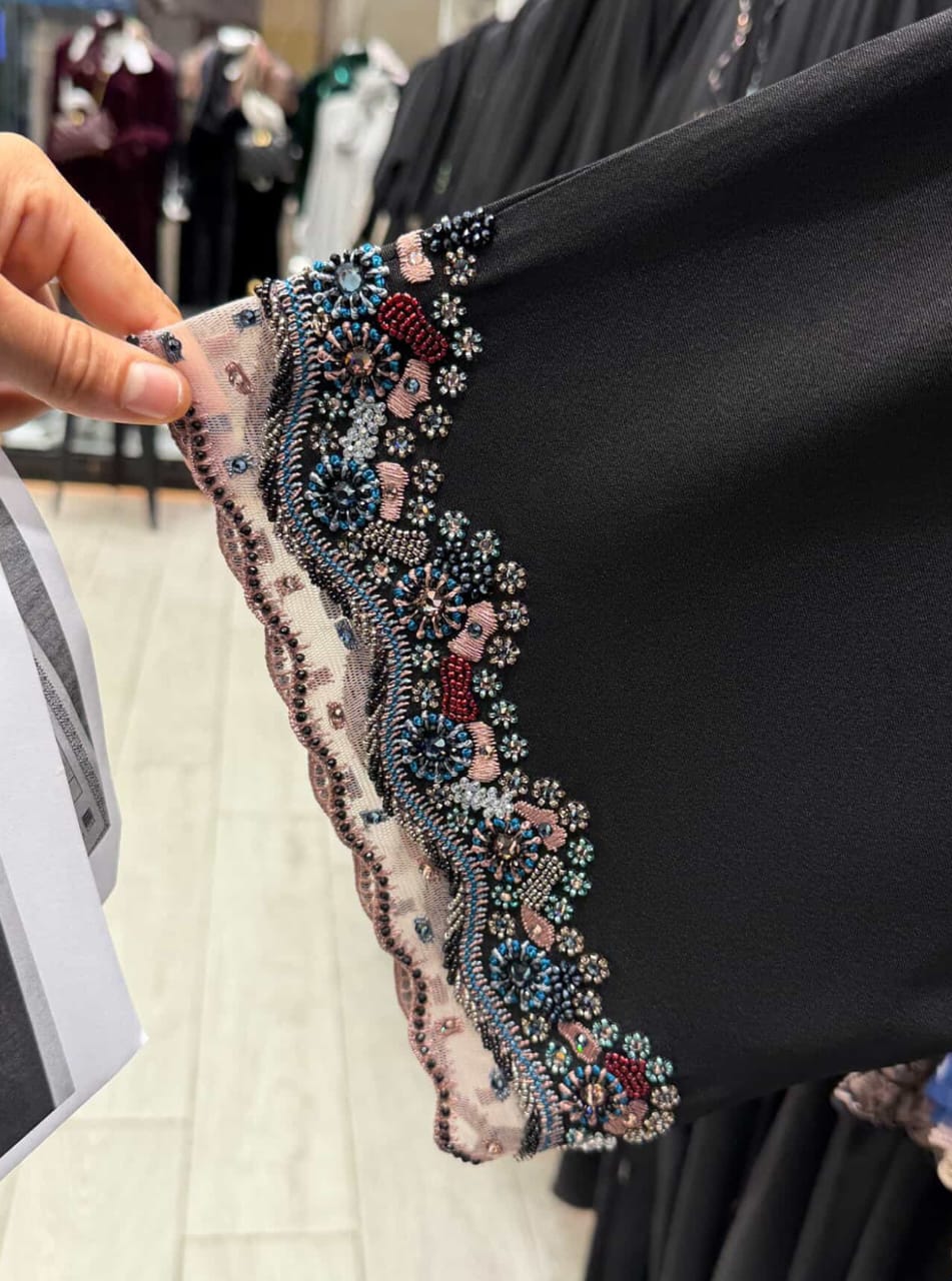 This elegant Hand Work Abaya showcases exquisite craftsmanship with detailed hand embroidery. Adorned with fine beadwork, zari, sequins, and delicate thread work, it reflects a perfect blend of luxury and grace. Crafted from premium quality, soft-flowing fabric, this abaya offers both comfort and a sophisticated silhouette.