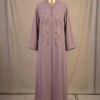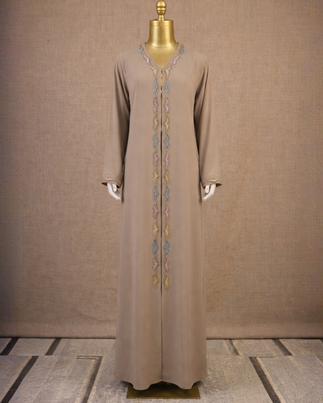 Return To ShopA classic beige abaya featuring subtle multicolor embroidery along the front, designed with a clean silhouette for comfortable and elegant everyday wear.