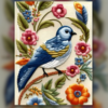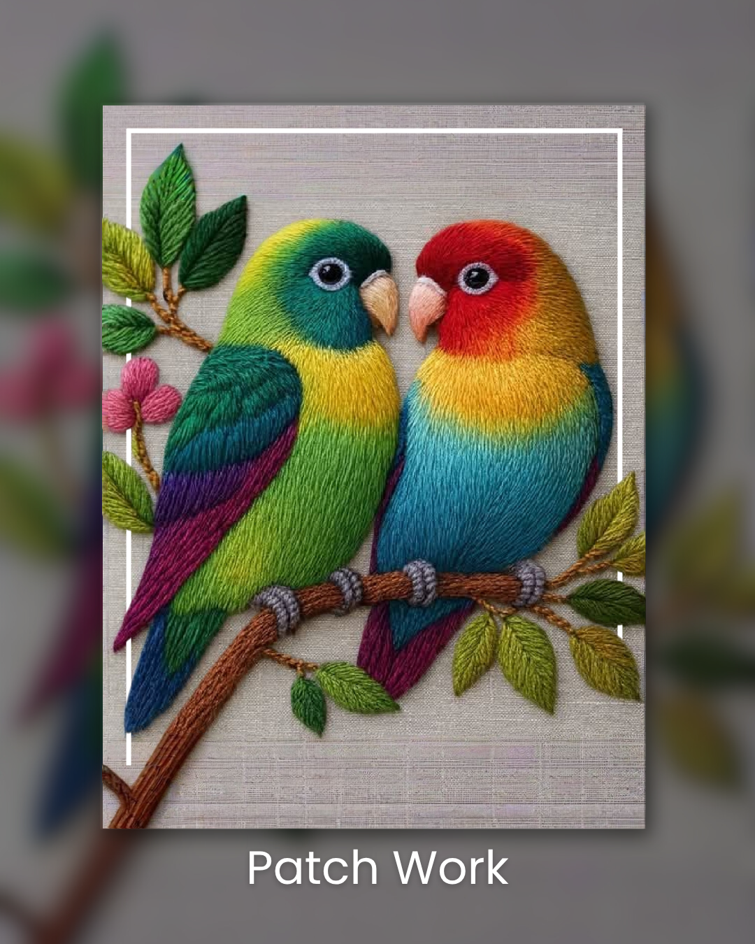 This charming patch work design features two colorful birds sitting closely on a branch, creating a warm and lively visual. The artwork is made with detailed thread work that gives the feathers a soft textured feel and a handcrafted appearance. Bright shades of green, yellow, blue, and red bring energy to the design, while small leaves and floral elements around the birds add a natural and decorative touch.