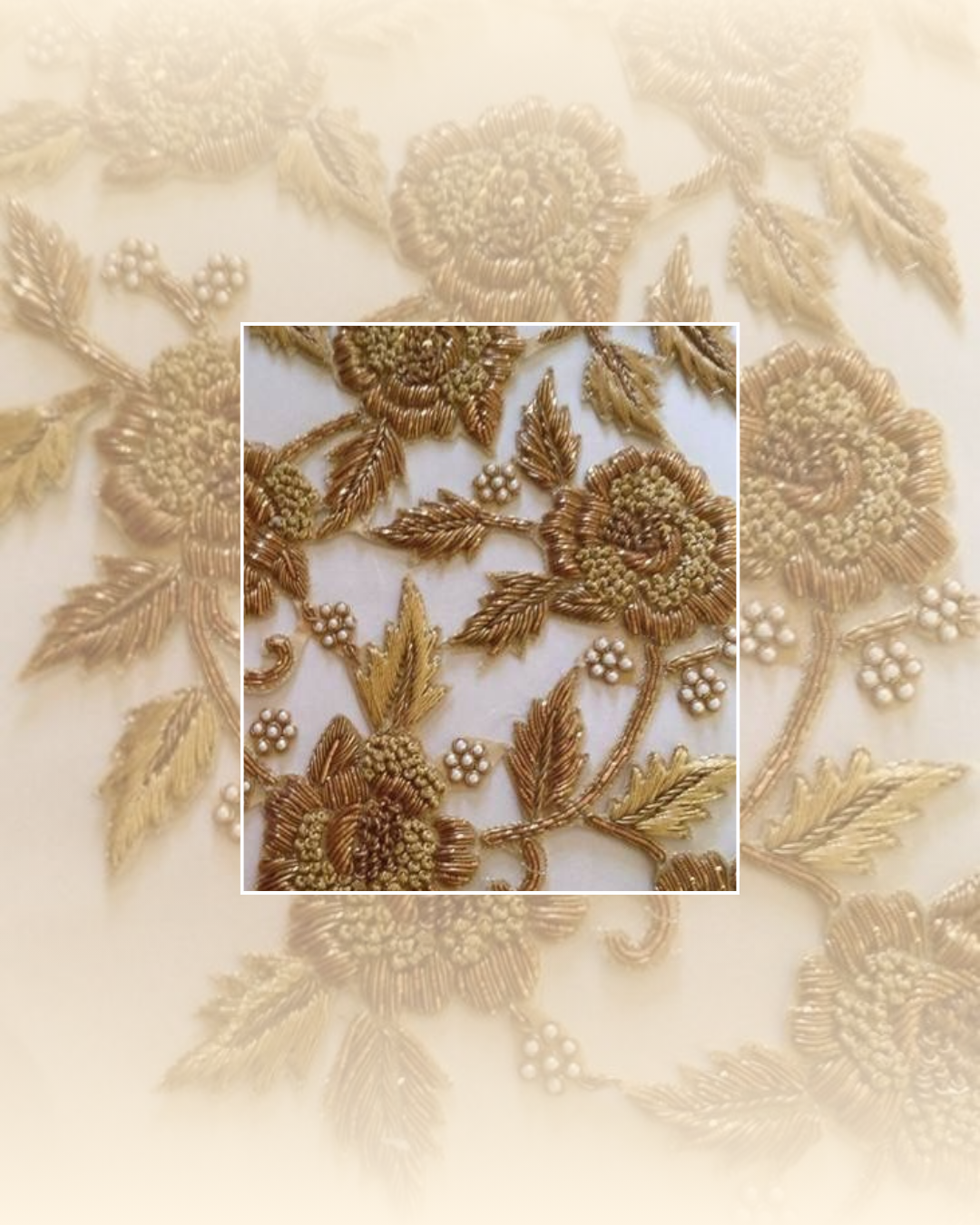 Return To ShopSophisticated cream fabric featuring rich antique gold floral embroidery with bead detailing, ideal for bridal and luxury wear.