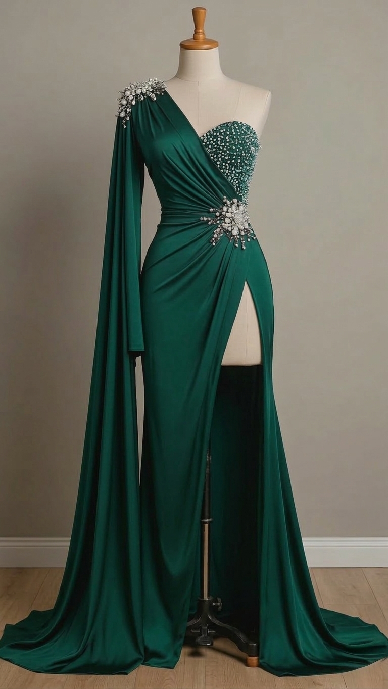 This emerald green evening gown is designed to give a bold yet elegant look. The one-shoulder style with a long draped sleeve makes the dress feel very stylish and different from regular gowns. Soft gathers across the waist create a flattering shape, while the crystal detail placed at the center adds a subtle sparkle and draws attention naturally.