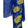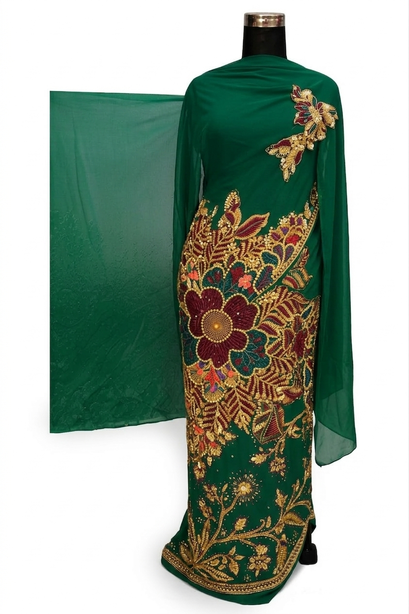 This stunning Sudanese Toub comes in a deep emerald green shade that instantly gives a festive and graceful feel. The highlight of the design is the large hand-embroidered floral motif placed across the lower drape, created with detailed beadwork, sequins, and thread embroidery. Rich tones of maroon, gold, and subtle multicolor accents bring life to the pattern and make the outfit look vibrant and special.