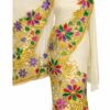The embroidery flows naturally along the border and extends softly towards the upper section, creating a balanced and artistic look. The lightweight sheer fabric drapes smoothly around the body, allowing comfortable movement while maintaining an elegant traditional silhouette.