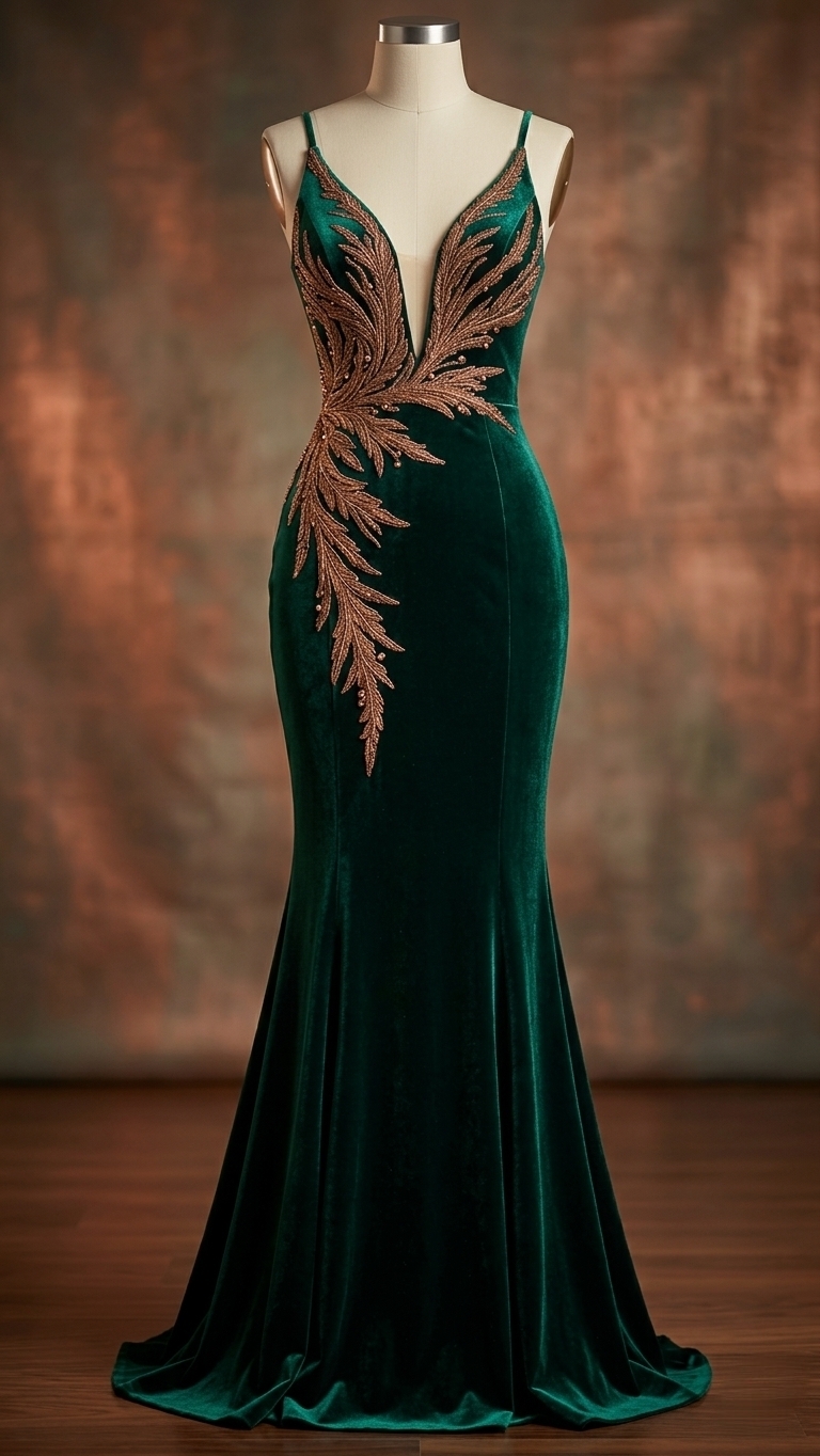 Return To ShopElegant emerald velvet evening gown with deep neckline and leaf-inspired embroidery, featuring a flattering fitted silhouette ideal for formal events and evening occasions.