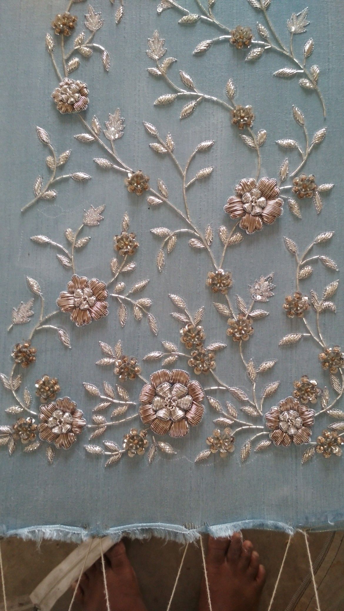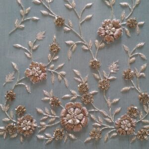 Return To ShopA close-up of a deep maroon fabric richly embroidered with gold floral and vine patterns, featuring intricate borders and delicate beadwork.