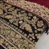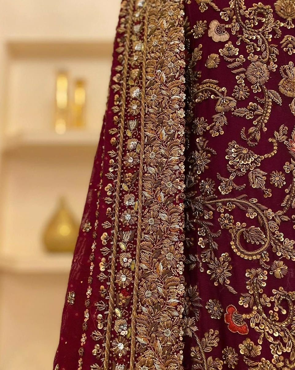 This image presents a close-up view of an exquisitely crafted traditional garment made from deep maroon fabric. The surface is densely decorated with intricate gold embroidery, featuring flowing floral patterns, delicate vines, and symmetrical ornamental designs. The borders are especially detailed, showcasing layered embroidery with metallic threads, small beads, and sequins that add texture and depth. The contrast between the rich maroon base and the shimmering gold work creates a sense of luxury and grandeur. The background is softly blurred, drawing full attention to the fine craftsmanship and suggesting a ceremonial or formal setting, such as a wedding or cultural celebration.