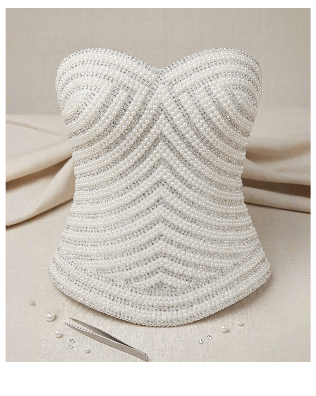 The panel features intricate handwork with finely placed pearls and subtle crystal detailing arranged in a beautiful chevron pattern. The structured sweetheart shape enhances the overall silhouette, giving a flattering and designer-inspired finish to your blouse or corset-style outfit.