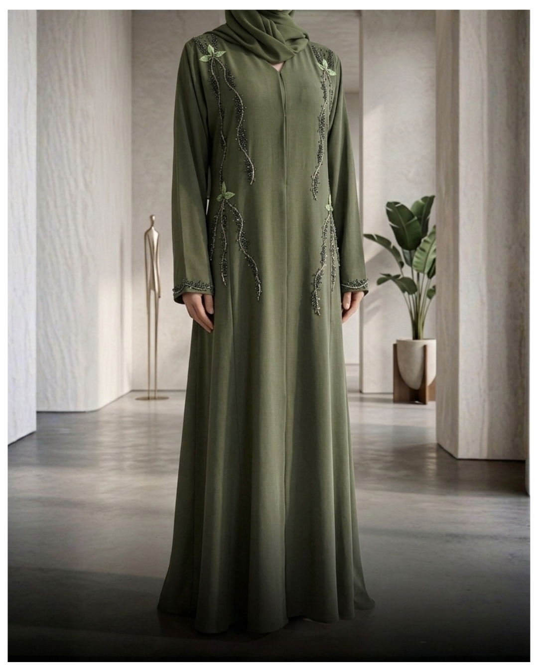 The standout feature of this abaya is its delicate vine-inspired embroidery that flows vertically along the front. The fine detailing, paired with soft beadwork accents, creates a beautiful, elongated effect that enhances the overall silhouette. Small leaf motifs add a natural touch, giving the design a fresh and modern look while still maintaining a classic appeal.