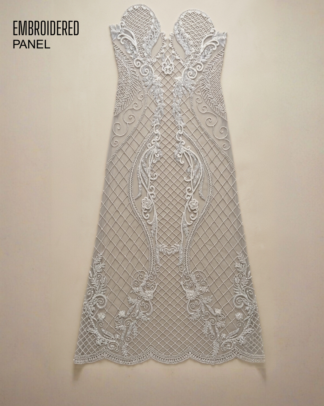 Elevate your design with this stunning embroidered panel that beautifully blends structured lattice patterns with graceful ornamental motifs. The elongated silhouette and intricate threadwork create a flattering, couture-inspired look that enhances the elegance of any outfit. Its soft ivory tone and refined detailing make it a perfect choice for bridal creations, festive sabai, statement gowns, or luxury occasion wear.