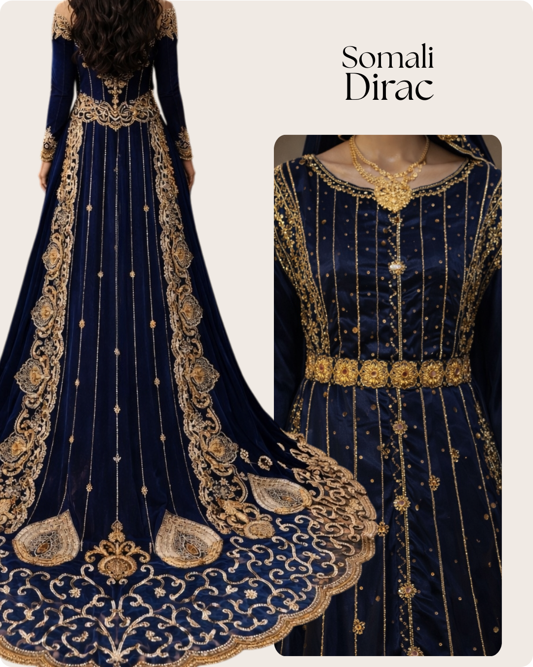 This beautiful Somali Dirac comes in a rich royal blue shade that instantly gives a graceful and festive feel. The dress is detailed with elegant gold embroidery placed in vertical lines across the body, creating a long and flattering look. A decorative embroidered belt design at the waist adds shape and brings attention to the silhouette.