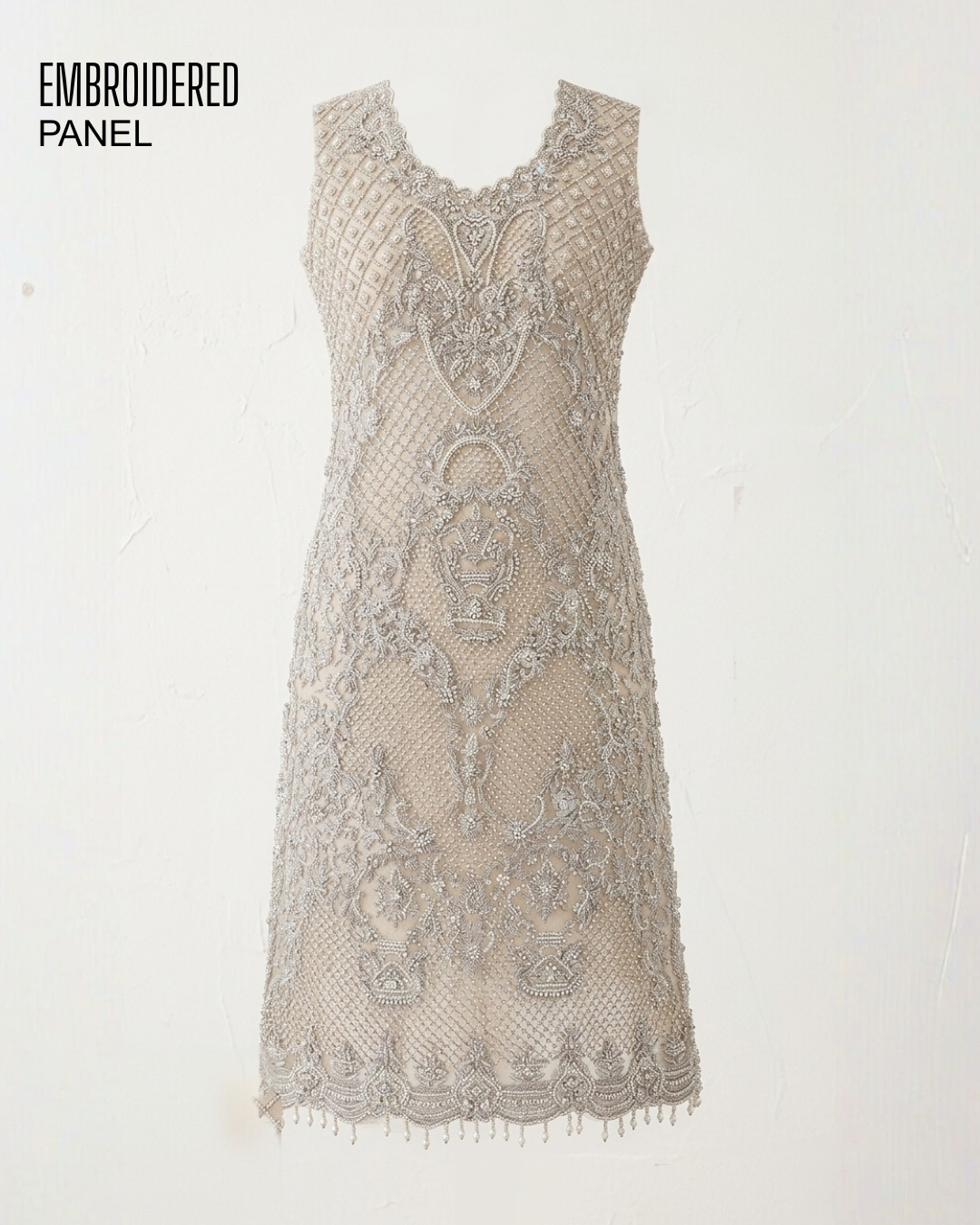 Create a truly luxurious outfit with this stunningly detailed embroidered panel, designed to make every silhouette look graceful and refined. Featuring intricate lattice patterns combined with ornate floral and regal motif embroidery, this panel reflects timeless craftsmanship and high-fashion appeal. The soft neutral tone enhances its premium look, making it a perfect choice for bridal wear, festive couture, sabai, or statement evening dresses.