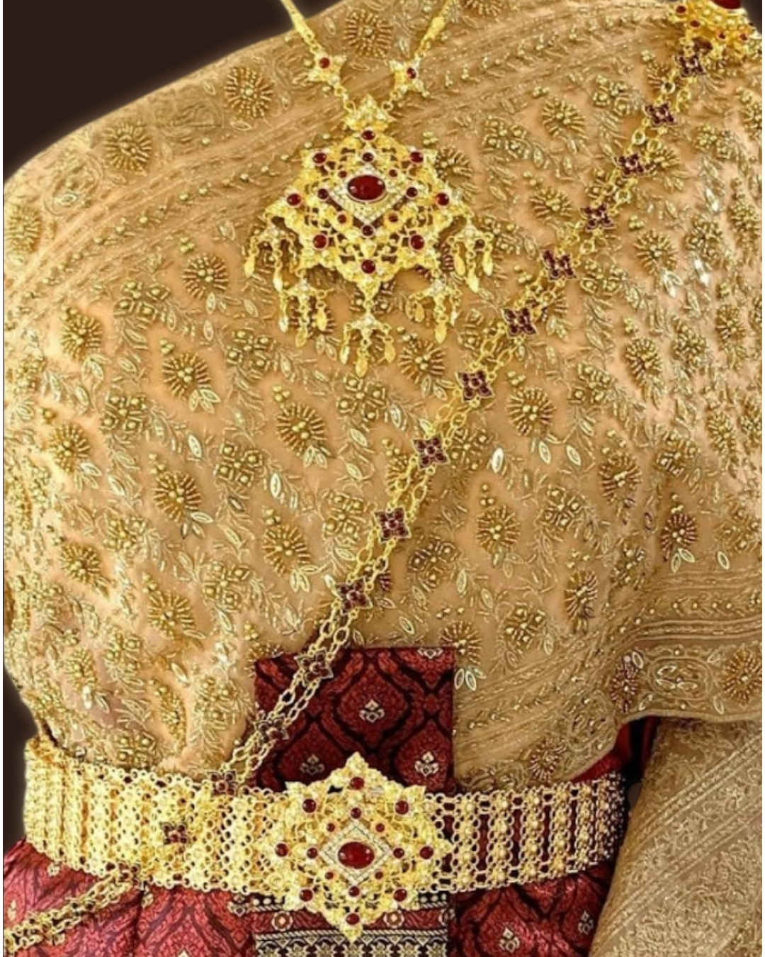 Return To ShopElegant golden Sabai dress with traditional embroidery and regal styling details. Ideal for weddings, festive events and cultural occasions.