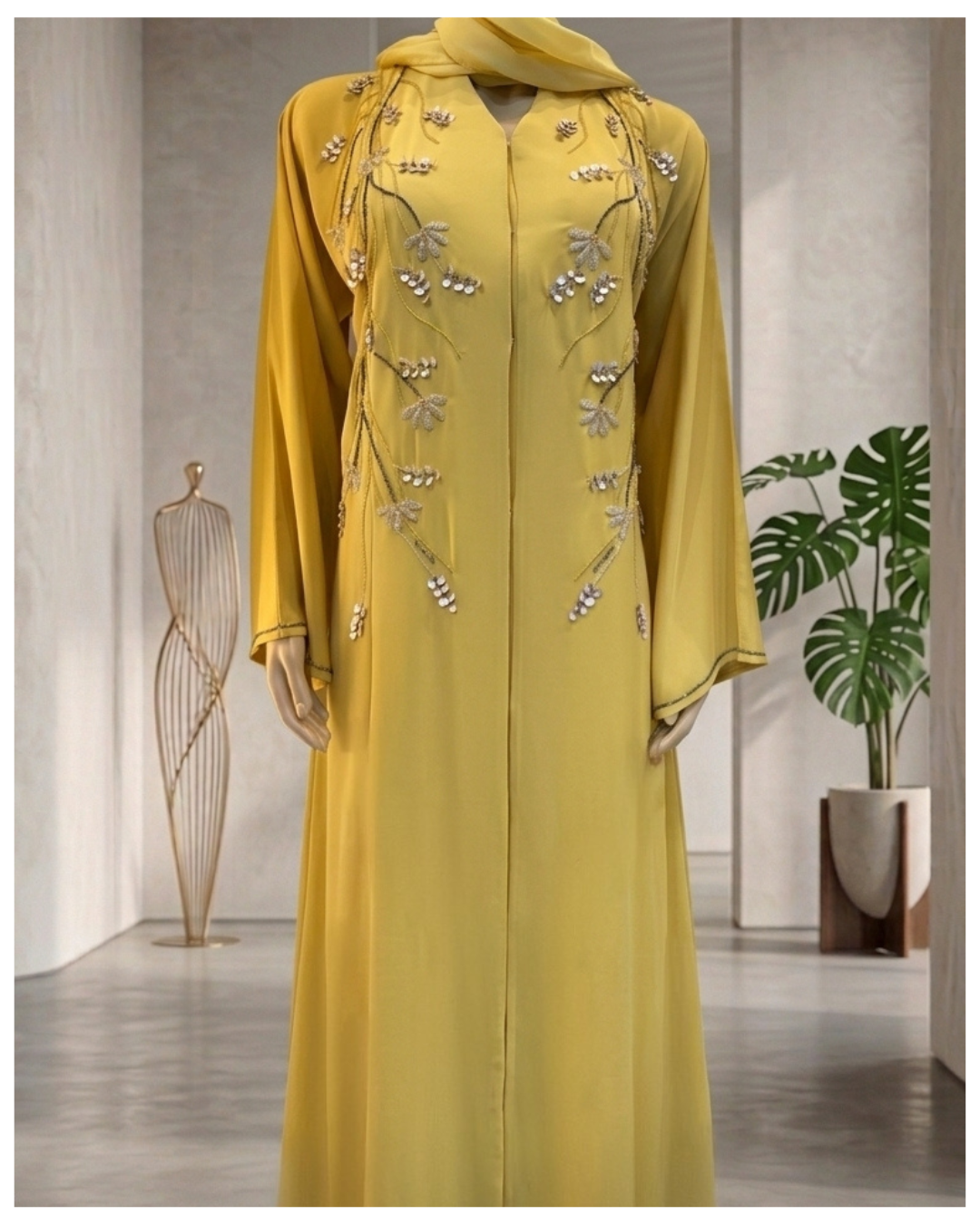 Bright, graceful, and full of charm — this sunshine yellow abaya is designed to make a subtle yet beautiful statement. The warm, vibrant tone instantly adds freshness to your look, making it a perfect choice for daytime events, festive occasions, or whenever you want to stand out with elegance.
